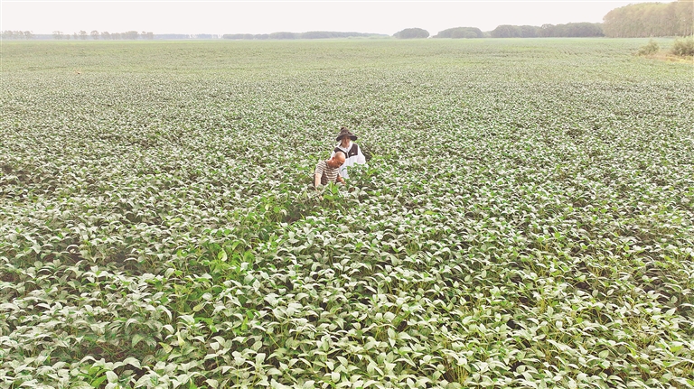 26日,在北大荒農(nóng)業(yè)股份二九〇分公司一片大豆田中,種植戶戎立國正在查看作物長勢。表面望去,這片田地與普通大豆無異,這里實際種植的,是特色黑豆品種。