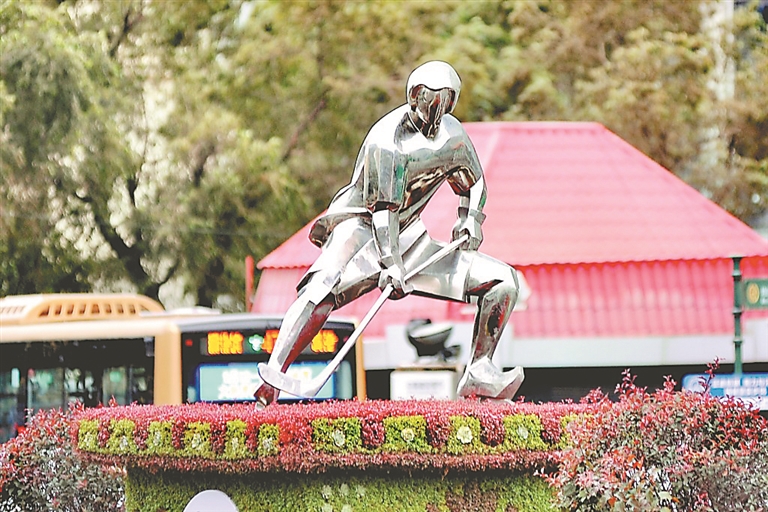 9日,在哈爾濱市南崗區(qū)紅軍街上,一處綠地里以亞冬會冰雪比賽項目為主題的雕塑群吸引了行人的目光。這些雕塑外觀銀色、制作精美、栩栩如生,展現(xiàn)了運動員奮力拼搏、勇往直前的精神風(fēng)貌。
