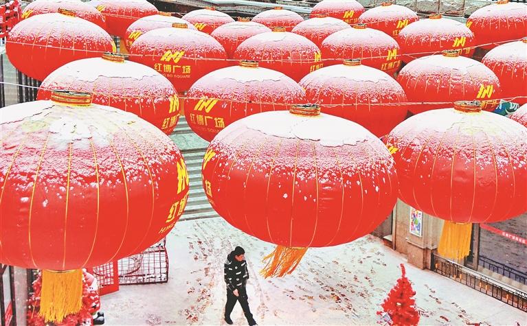 7日,臘八節(jié),哈爾濱市迎來降雪天氣。在白雪映襯下,街邊和廣場上懸掛的大紅燈籠更顯喜慶。街上的行人紛紛拿出手機(jī)拍下精彩瞬間。在一些市場內(nèi),銷售臘八粥、臘八蒜的攤位擠滿了消費者,生意十分紅火。