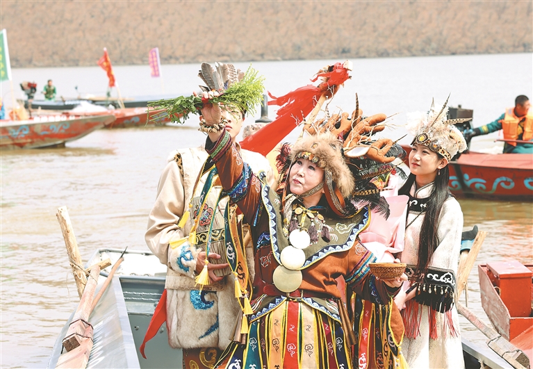 1日,饒河縣第十三屆烏蘇里江開江文化節(jié)在四排赫哲族鄉(xiāng)開幕。圖為船頭祈福。