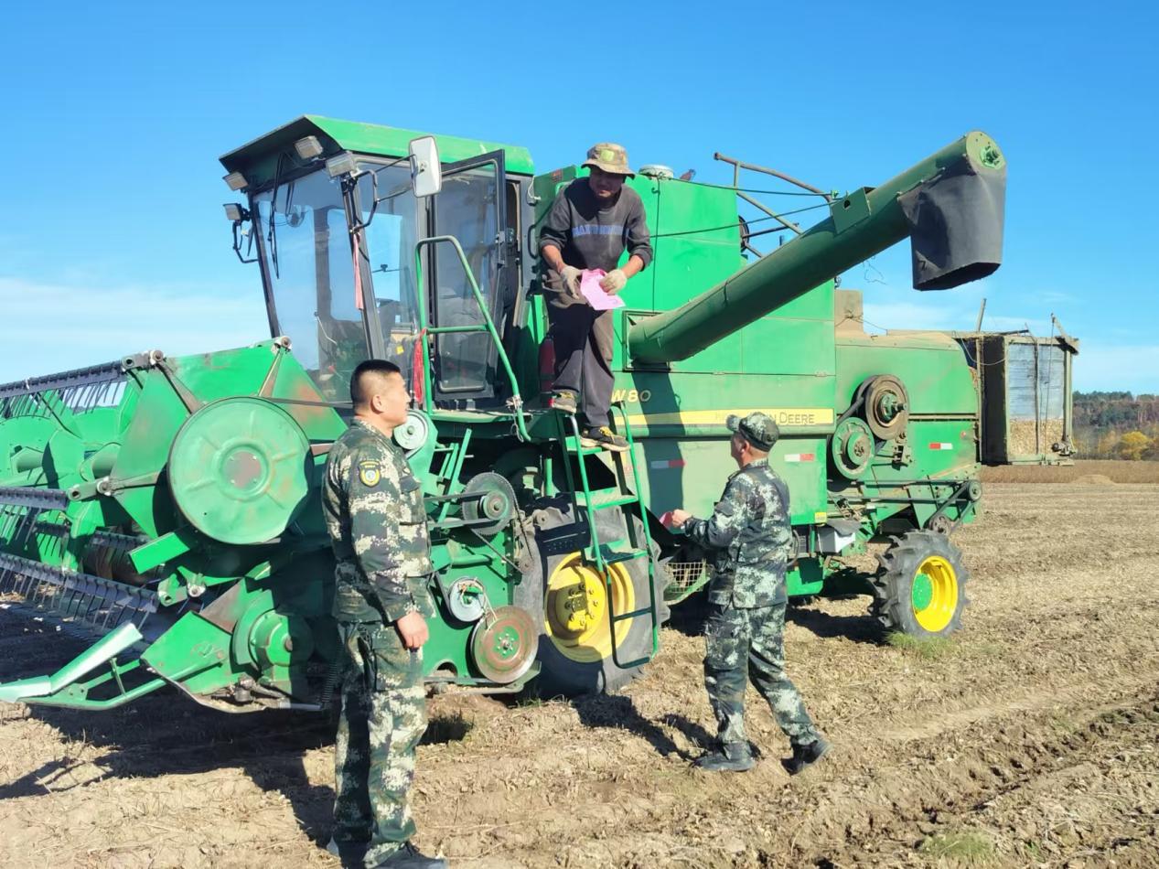 督導(dǎo)組在為秋收農(nóng)機(jī)操作員講解防火法規(guī)(孟鵬翔 攝)