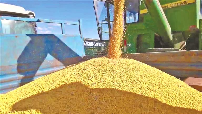 在海倫市前進(jìn)鎮(zhèn)雙泉村大豆農(nóng)業(yè)示范園區(qū),1510畝核心種植區(qū)宛如一塊碩大的金色地毯,格外引人注目。大型收割機(jī)轟鳴作業(yè),將飽滿的豆莢卷入機(jī)身,留下整齊的根茬,處處是忙碌的豐收景象。采訪中記者了解到,這里是全國大豆產(chǎn)業(yè)發(fā)展的“標(biāo)桿示范區(qū)”,該園區(qū)由軍琢農(nóng)機(jī)專業(yè)合作社負(fù)責(zé)種植經(jīng)營管理,海倫市農(nóng)業(yè)技術(shù)推廣中心的科技人員常年駐守田間,從種植方案制定,到田間技術(shù)培訓(xùn),再到生產(chǎn)過程中的實(shí)時指導(dǎo),全程為大豆種植“把脈護(hù)航”。