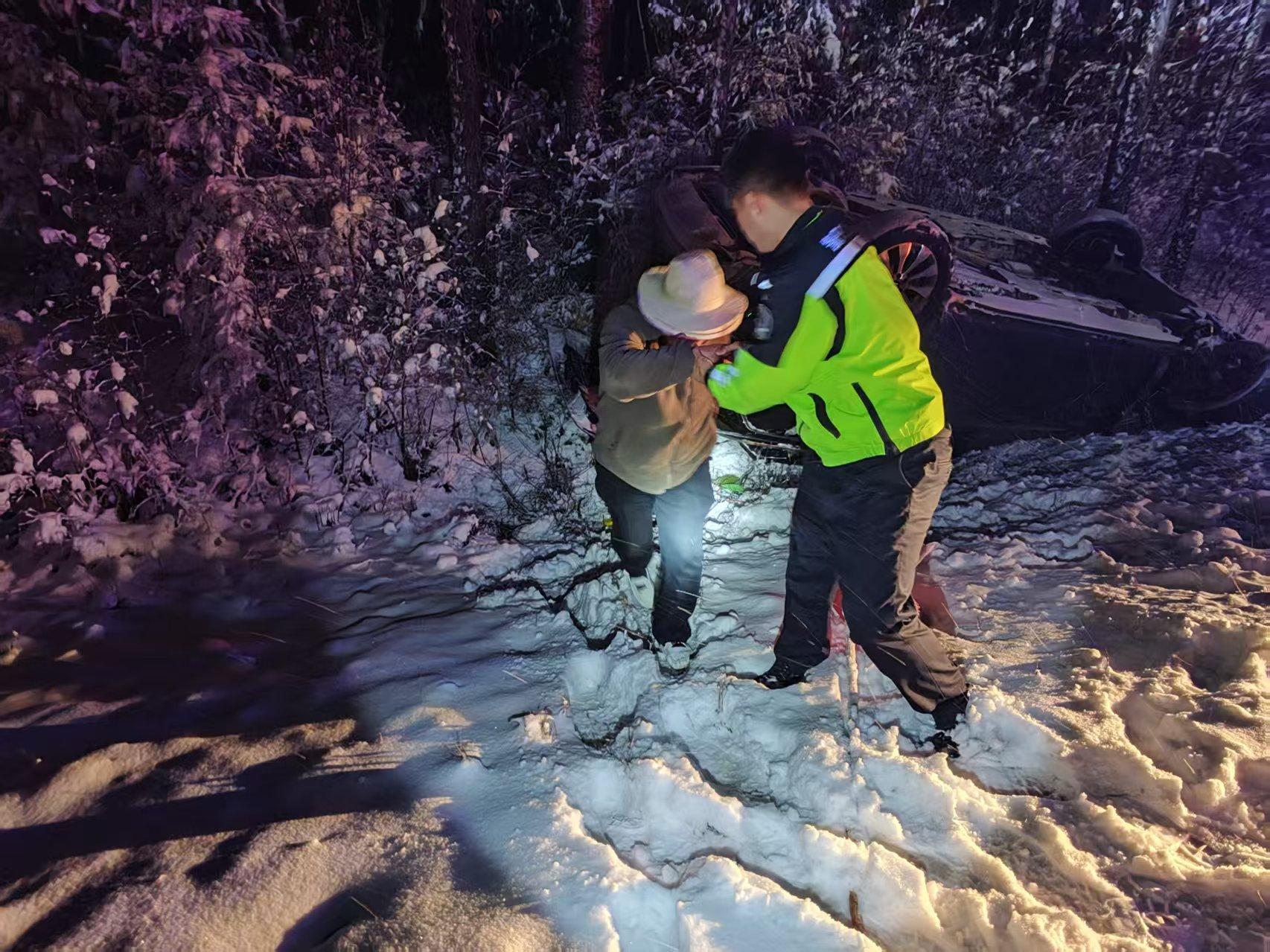 到達(dá)現(xiàn)場后,民警立即下車進(jìn)行查看,發(fā)現(xiàn)一輛外地車牌的小型汽車側(cè)翻在3米的道路下,一對中年夫妻正在車內(nèi)拿取行李箱。見此情形,民警立即向夫妻施以援手,將這對夫妻從溝中拉拽上來,在確認(rèn)二人安全后了解到,二人駕駛車輛從呼瑪趕往漠河,因?qū)β窙r不熟,加之駕駛?cè)嗽诒┞访骜{車經(jīng)驗(yàn)不足,操作不當(dāng),導(dǎo)致車輛側(cè)翻。