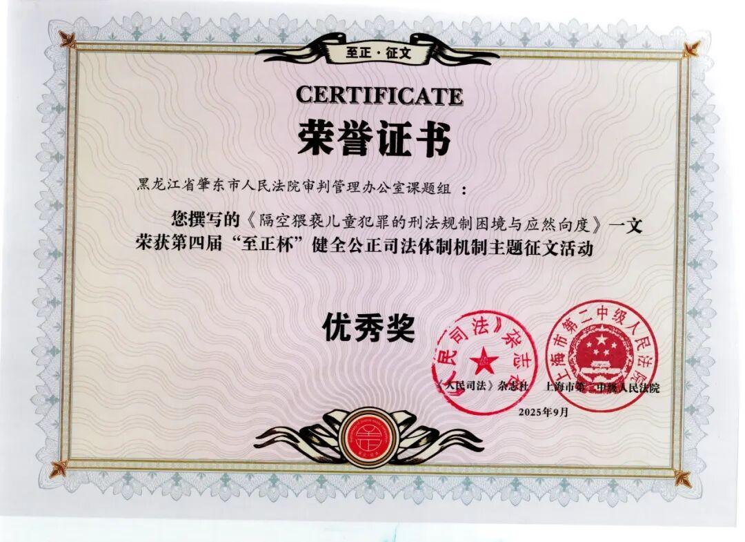 黑龍江經(jīng)濟(jì)網(wǎng)訊(董慧瑩 王岳)近日,由《人民司法》雜志社與上海市第二中級(jí)人民法院聯(lián)合舉辦的第四屆“至正杯”健全公正司法體制機(jī)制征文活動(dòng)結(jié)果揭曉。本屆征文共收到投稿1500余篇,經(jīng)評(píng)委會(huì)認(rèn)真評(píng)議,共評(píng)選出一等獎(jiǎng)5篇、二等獎(jiǎng)15篇、三等獎(jiǎng)50篇、優(yōu)秀獎(jiǎng)60篇。其中,肇東市人民法院審管辦(研究室)課題組撰寫的調(diào)研論文《隔空猥褻兒童犯罪的刑法規(guī)制困境與應(yīng)然向度》榮獲優(yōu)秀獎(jiǎng)。