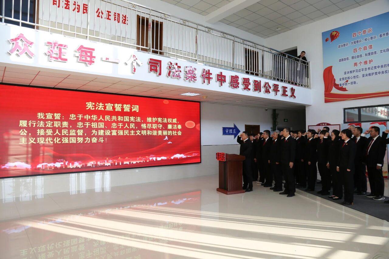 孫長(zhǎng)久院長(zhǎng)左手撫按憲法,舉起右拳,高聲領(lǐng)誓,各位干警莊嚴(yán)宣誓——“我宣誓:忠于中華人民共和國(guó)憲法,維護(hù)憲法權(quán)威,履行法定職責(zé),忠于祖國(guó)、忠于人民,恪盡職守、廉潔奉公,接受人民監(jiān)督,為建設(shè)富強(qiáng)民主文明和諧美麗的社會(huì)主義現(xiàn)代化強(qiáng)國(guó)努力奮斗!”
