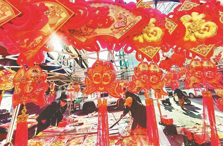 13日,哈爾濱市道外區(qū)大水晶街附近的集市上,許多市民在購買年貨。集市上,各種商品琳瑯滿目,應(yīng)有盡有。紅燈籠、“?!弊帧?duì)聯(lián)烘托出濃濃的喜慶氣氛。人們臉上都洋溢著幸福的笑容,個(gè)個(gè)滿載而歸。