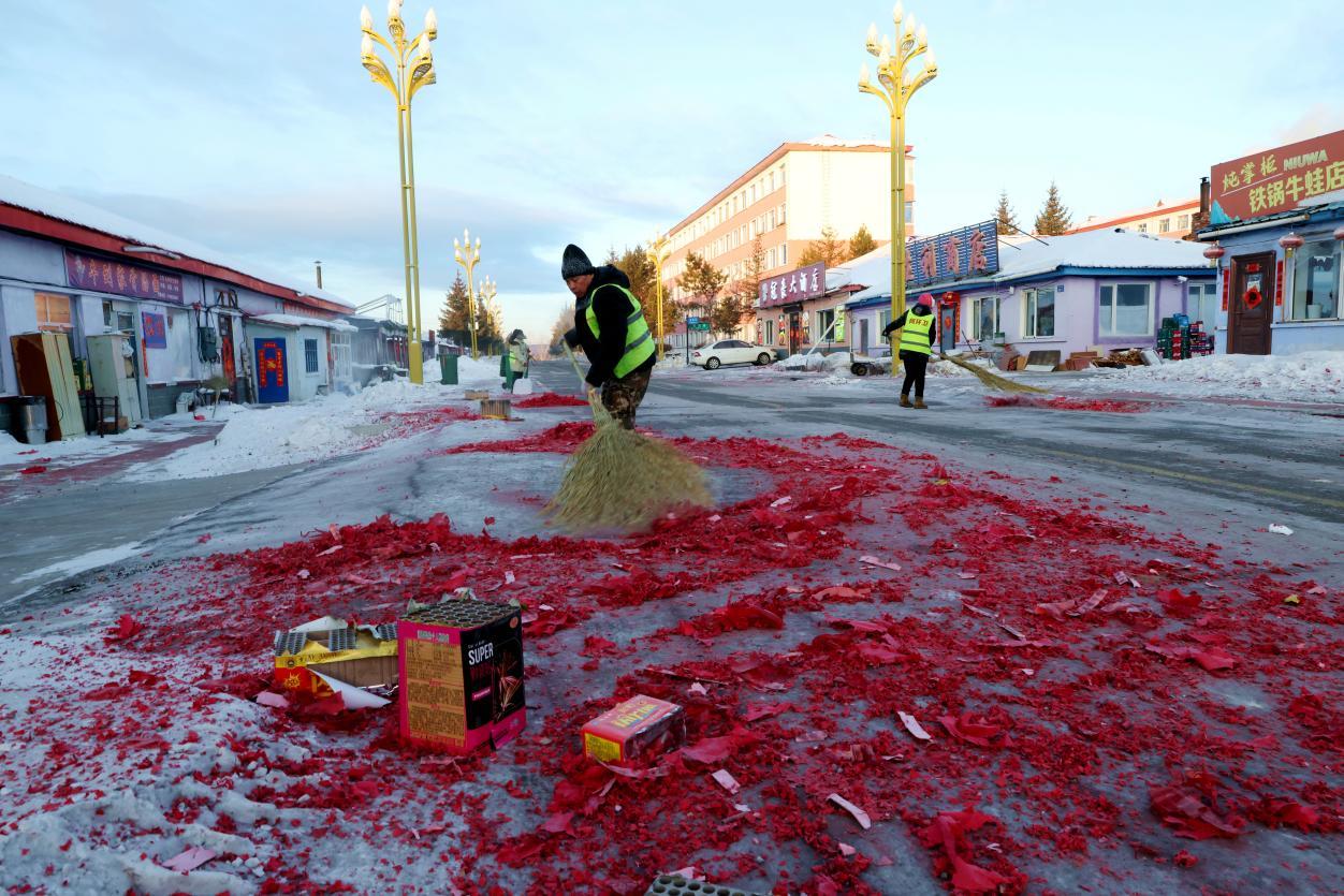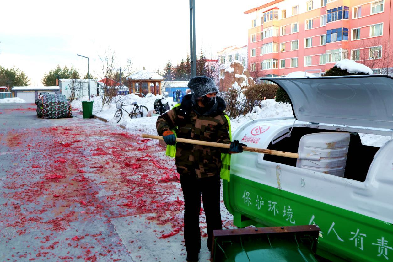 2月16日8點(diǎn),大街小巷年味正濃,鞭炮紙屑散落各處,行人寥寥。身穿黃馬甲的林業(yè)局環(huán)衛(wèi)工人已穿梭在街頭,帽子、睫毛凝滿白霜,手中掃帚不停揮舞,將鞭炮碎屑、生活垃圾及時(shí)清掃歸堆、裝車清運(yùn)。轉(zhuǎn)崗環(huán)衛(wèi)工人馬建民說:“我的責(zé)任區(qū)內(nèi)商戶多、居民多,春節(jié)期間工作量比平時(shí)多一倍,必須打掃干凈,讓大家過個(gè)舒心年?!痹谌w保潔員的奮戰(zhàn)下,居民區(qū)實(shí)現(xiàn)鞭炮紙屑隨放隨清、生活垃圾日產(chǎn)日清,大街小巷始終整潔有序。
