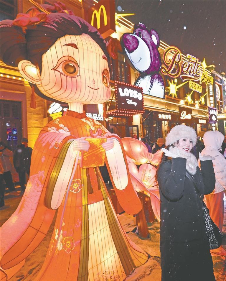 當(dāng)日,鵝毛大雪悄然灑落,覆蓋中央大街、松花江畔、中華巴洛克歷史文化街區(qū)等景區(qū)的各式花燈。紅燈籠覆上薄雪,愈顯艷麗;冰雕彩燈與雪相映,光影夢幻,將雪的清冽與燈的暖輝完美融合,整座城市宛如一幅雪景燈畫。