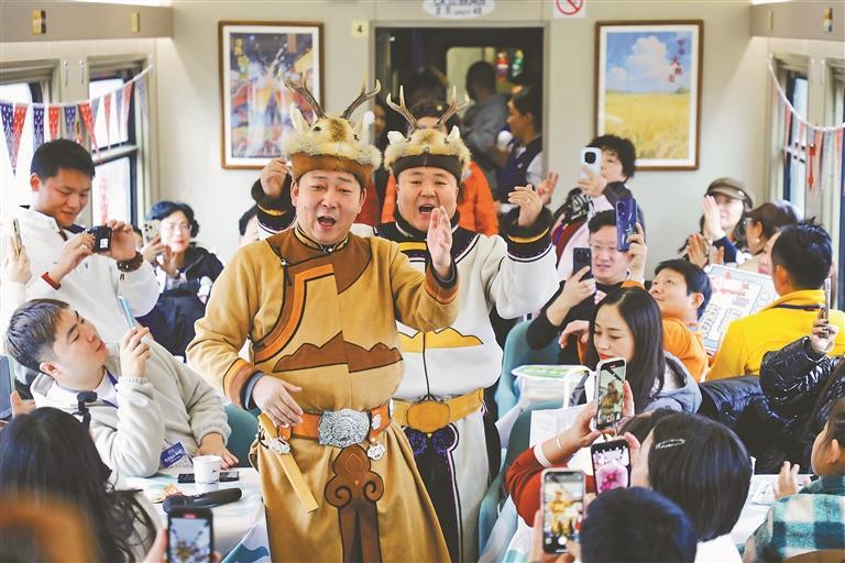 2月5日18時(shí)20分,K7041次“東北大花”主題列車(chē)從哈爾濱站緩緩駛出,一路向北,駛向漠河。車(chē)廂內(nèi),來(lái)自大興安嶺的鄂倫春族非遺代表性傳承人,現(xiàn)場(chǎng)展示用樺樹(shù)皮制作的手工藝品,列車(chē)工作人員身著民俗服飾帶領(lǐng)游客剪窗花,東北秧歌、二人轉(zhuǎn)表演更是點(diǎn)燃了旅途熱情。