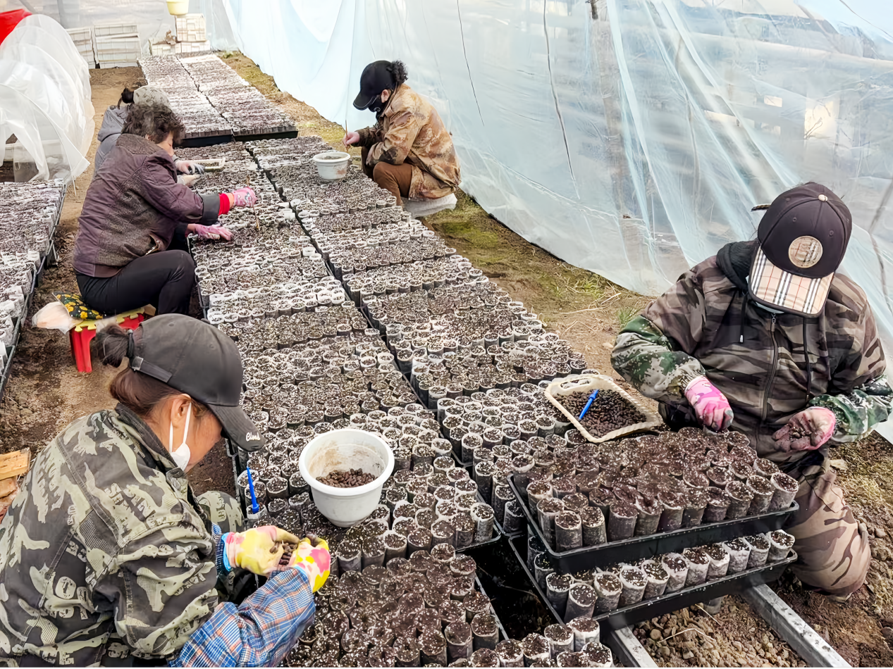 工作人員把西伯利亞紅松種子種入輕基質杯(劉磊 攝)
